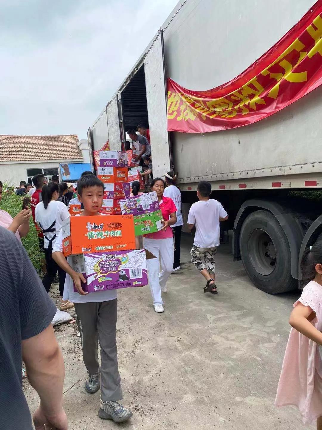 一辆满载纯净水和食品等抗洪救灾物资的卡车,